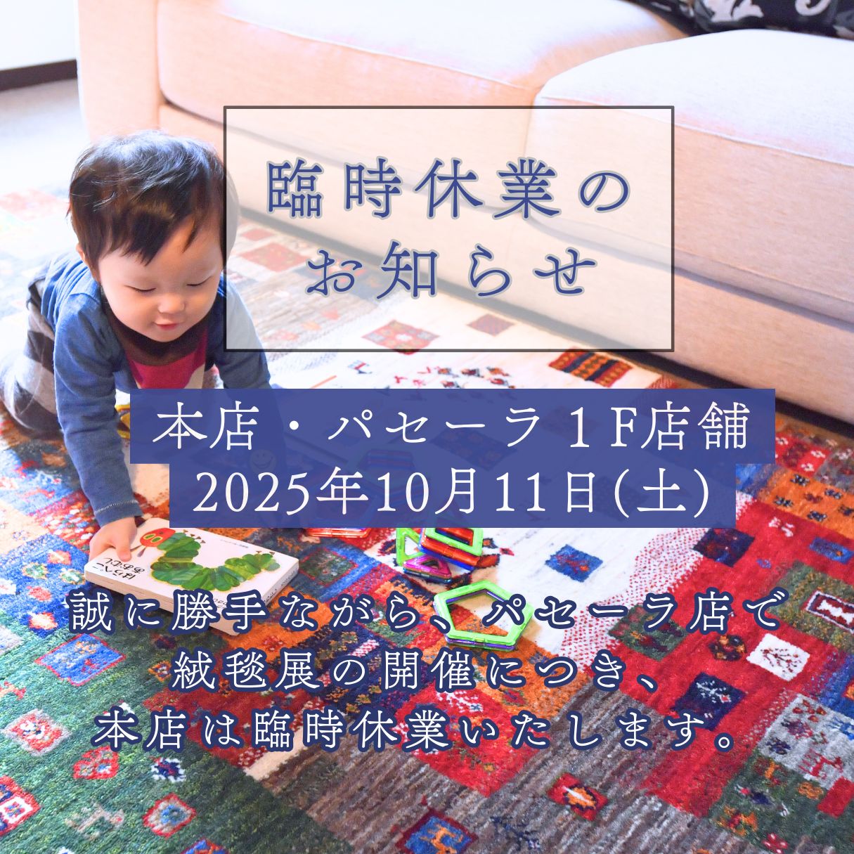 10/11(土) 絨毯展に伴う本店・パセーラ1F店舗 臨時休業のお知らせ 2025.10.10