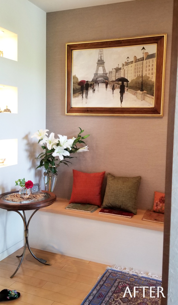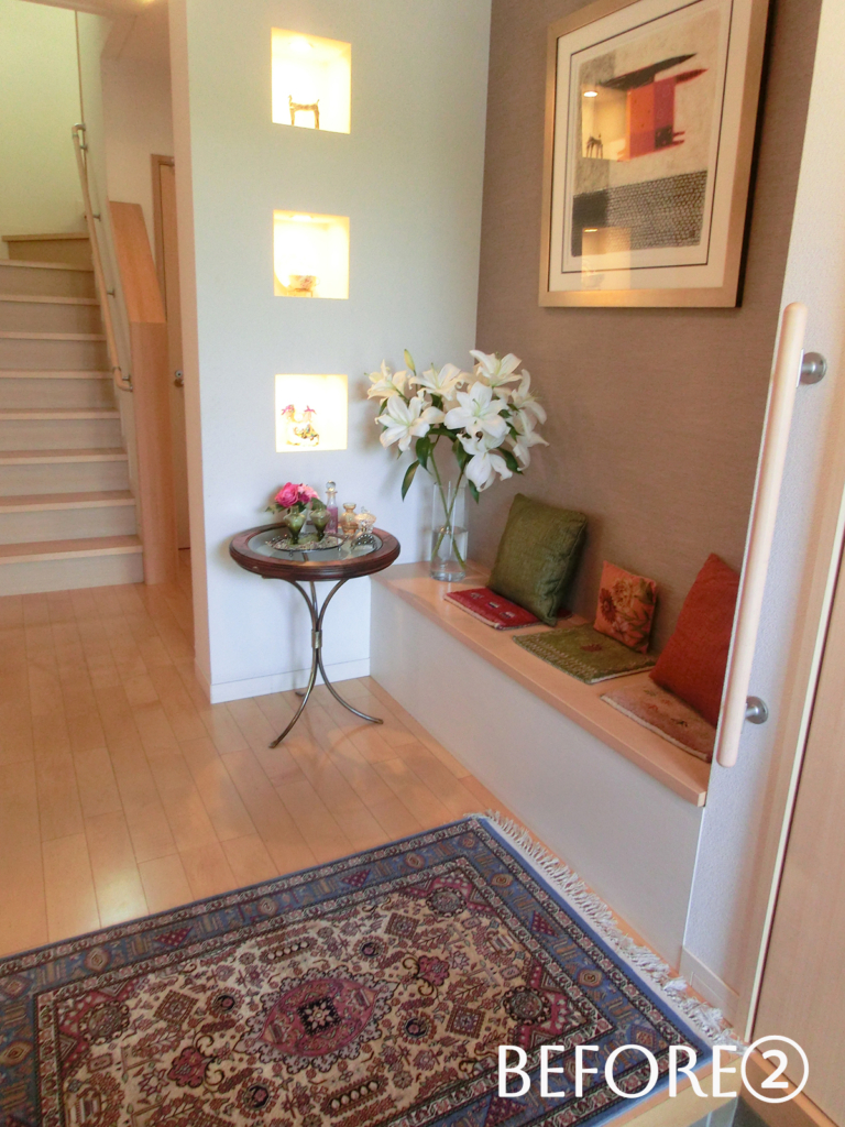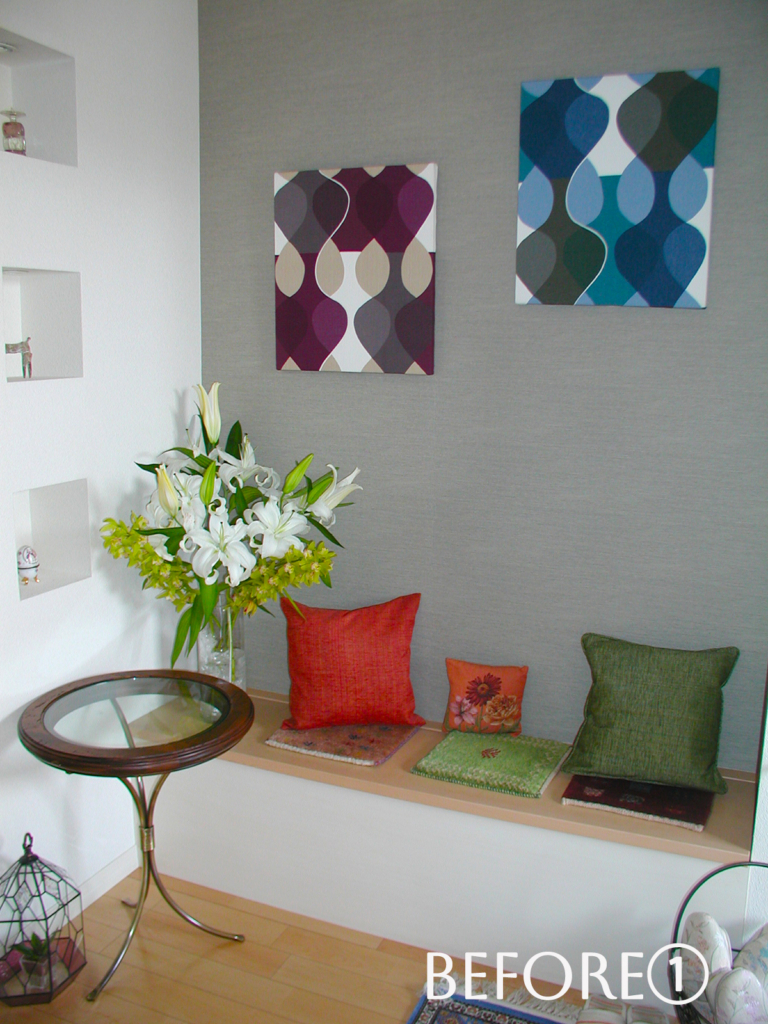 クッションや花の色もその都度変えながら、まるで季節を楽しむように“アートを着替える”おしゃれな玄関空間です。