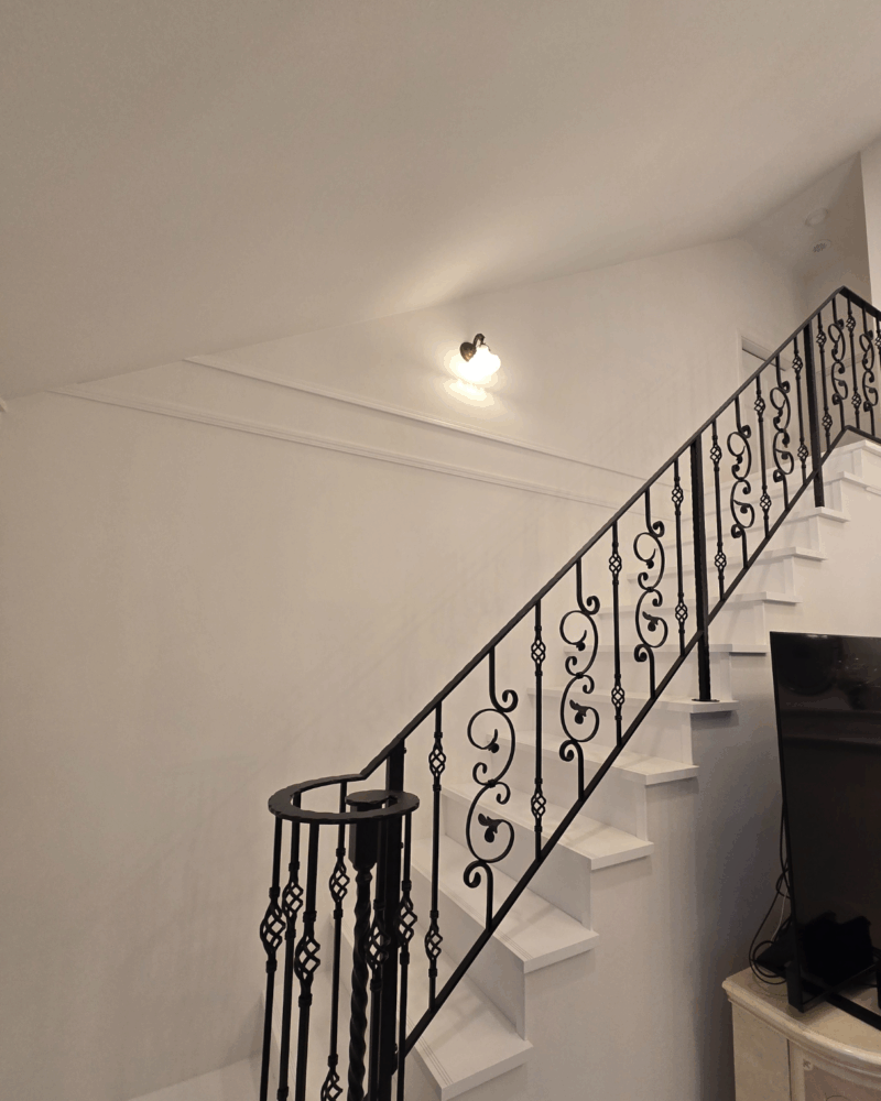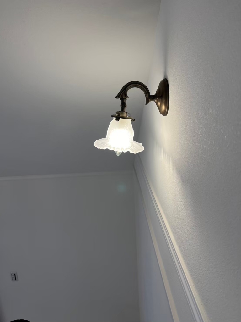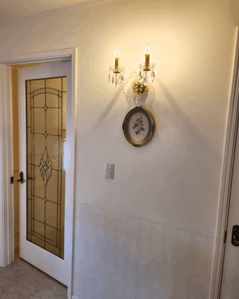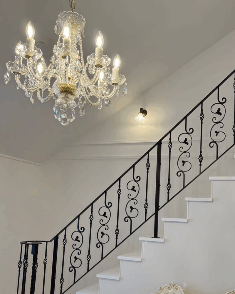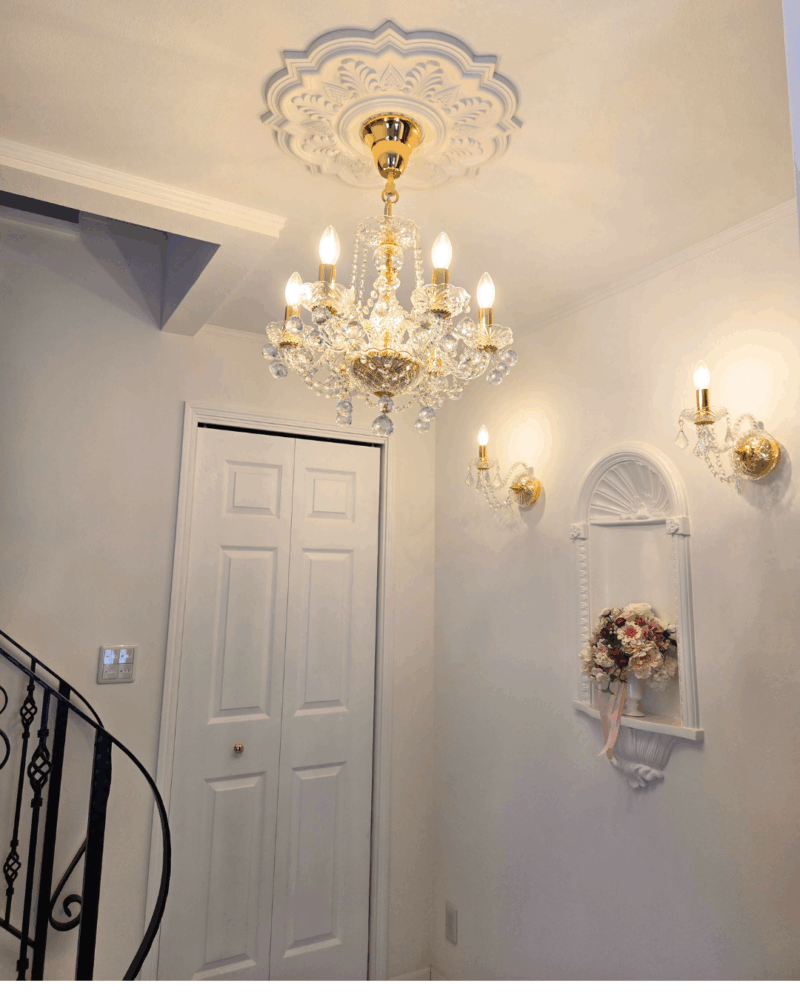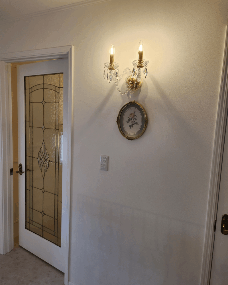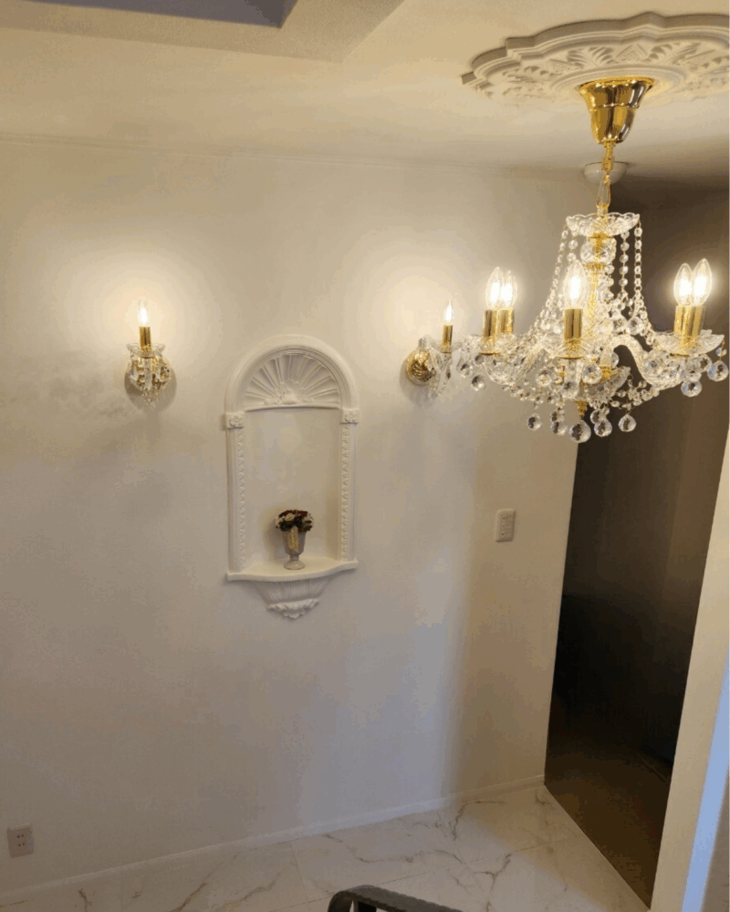 ブラケットランプから漏れたクリスタルの反射が、高い壁面に柔らかく映り、吹き抜けならではの開放感とエレガントさが際立つ仕上がりとなりました。