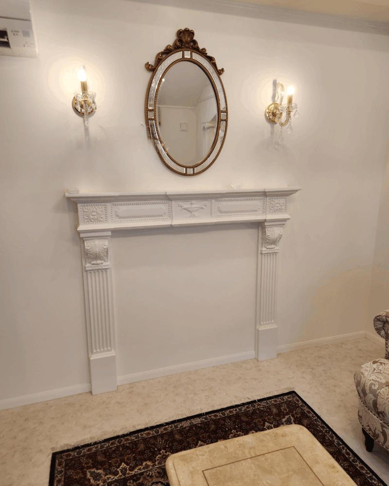 マントルピース上には、楕円のミラーを吊り海外ライクな雰囲気に仕上げました。