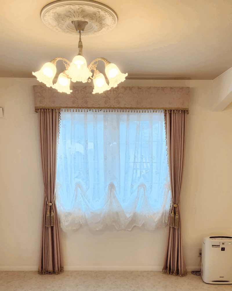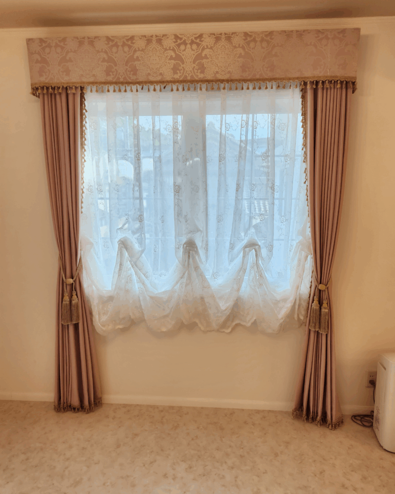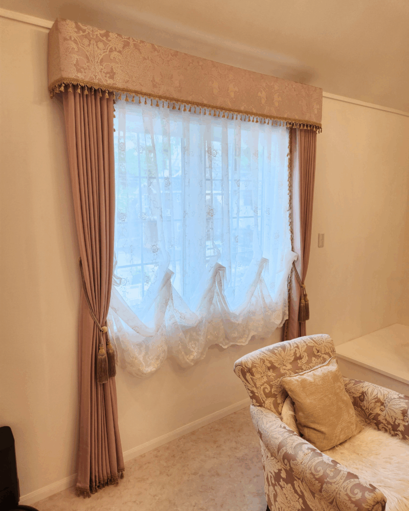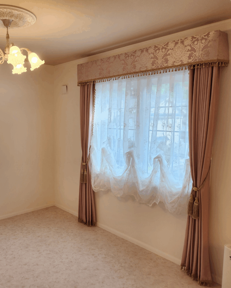 豪華なバランス飾りのついたカーテンは、前のお住まいから移設。レースは新調、バランスカーテン共に弊社で取付を行いました。