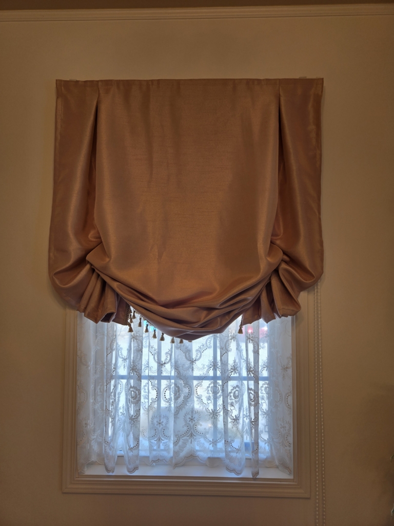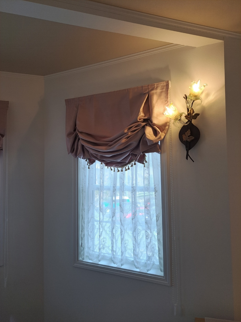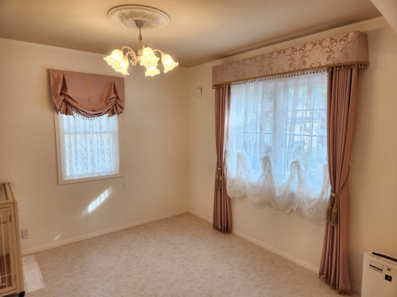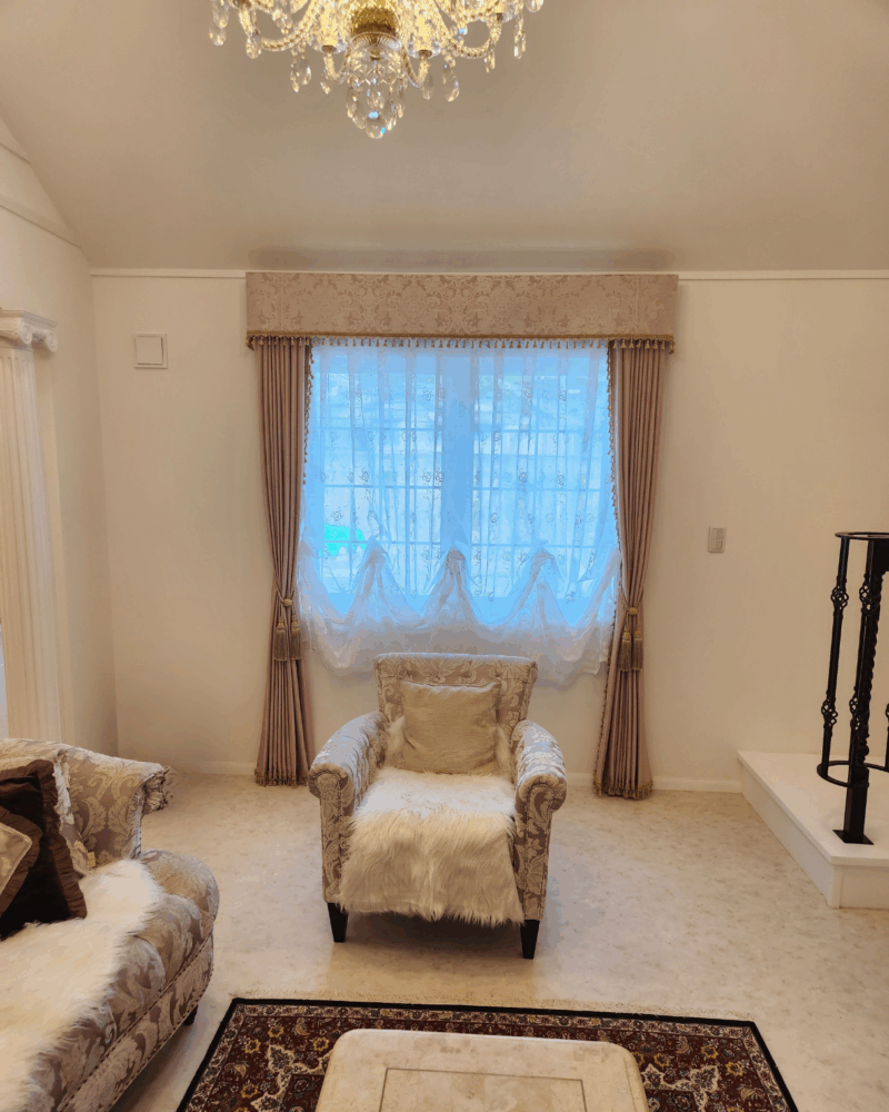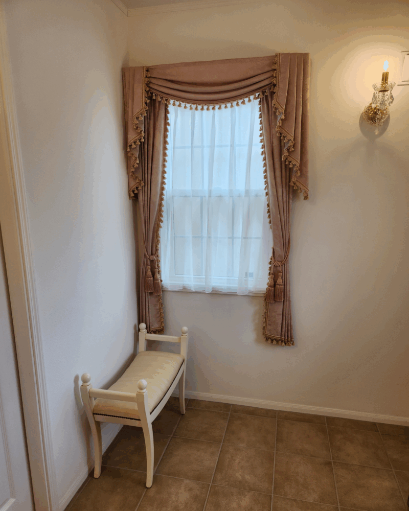 豪華なバランス飾りのついたカーテンは、前のお住まいから移設。レースは新調、バランスカーテン共に弊社で取付を行いました。