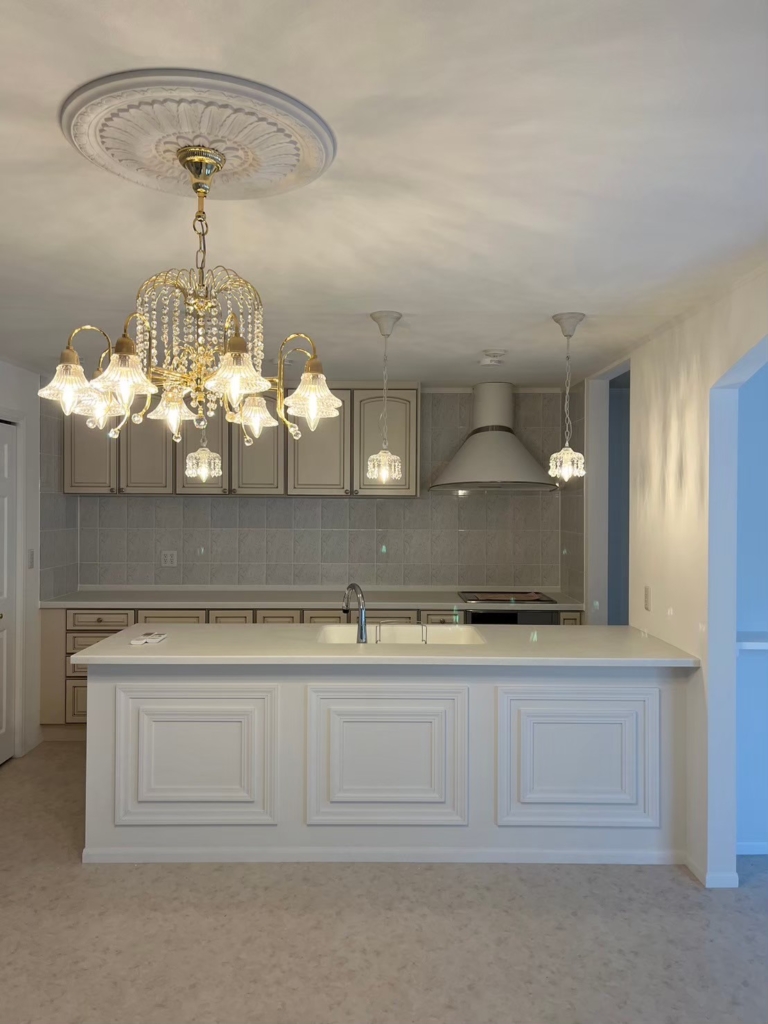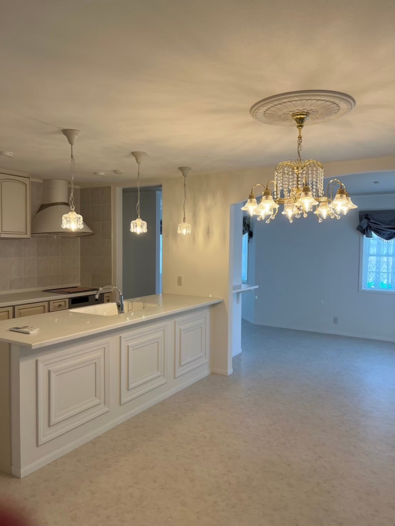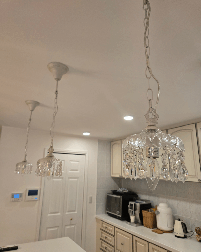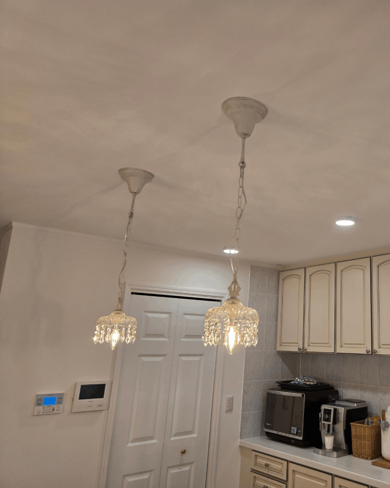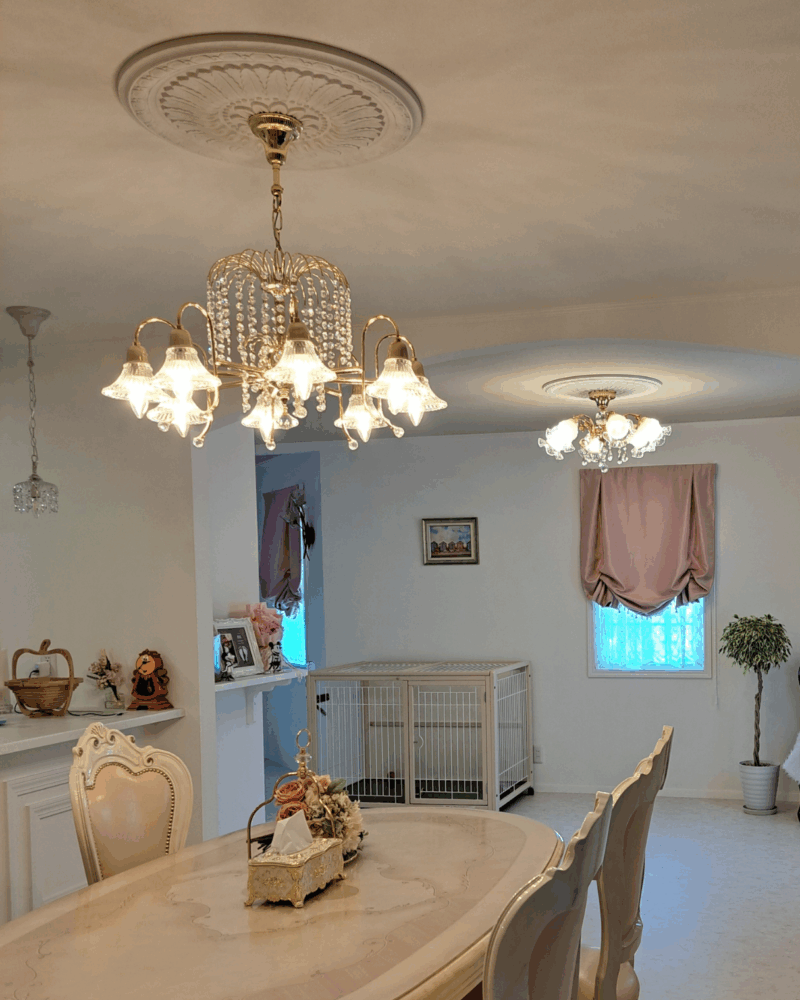 その後、ダイニング上のシャンデリアとより相性の良いシーリングシャンデリアを気に入っていただき、付け替えを行いました。