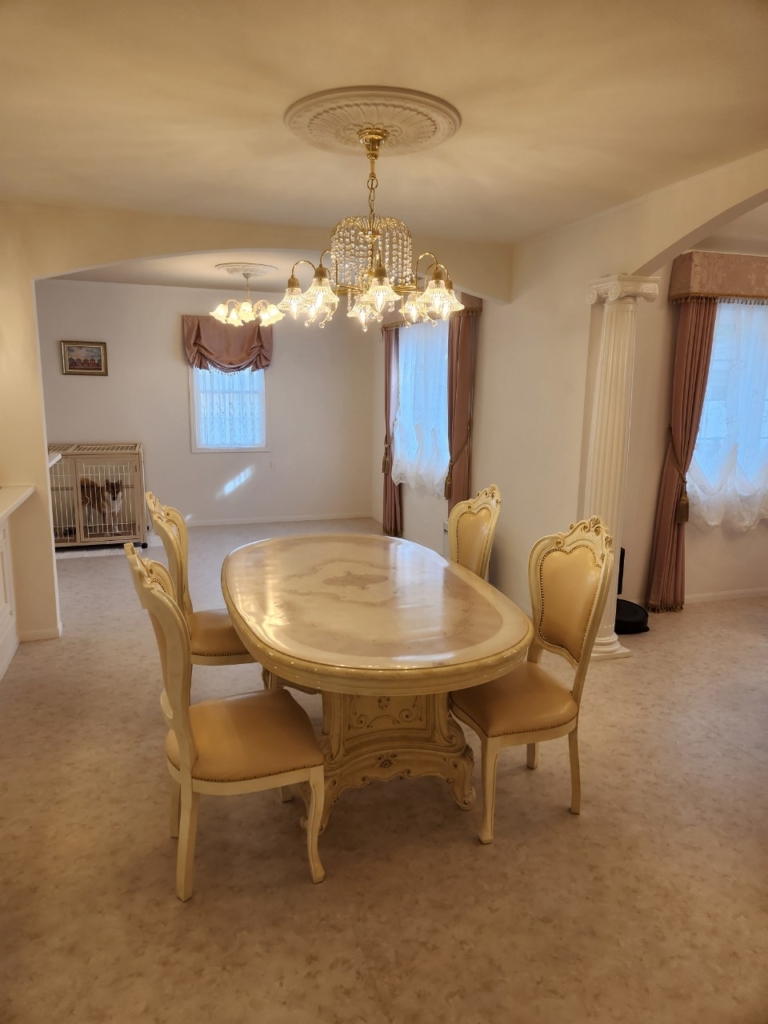 最初に取り付けていたシャンデリアは寝室へ移設し、ダイニングとお揃いのメダリオン装飾を合わせて取り付けました。