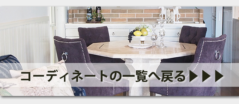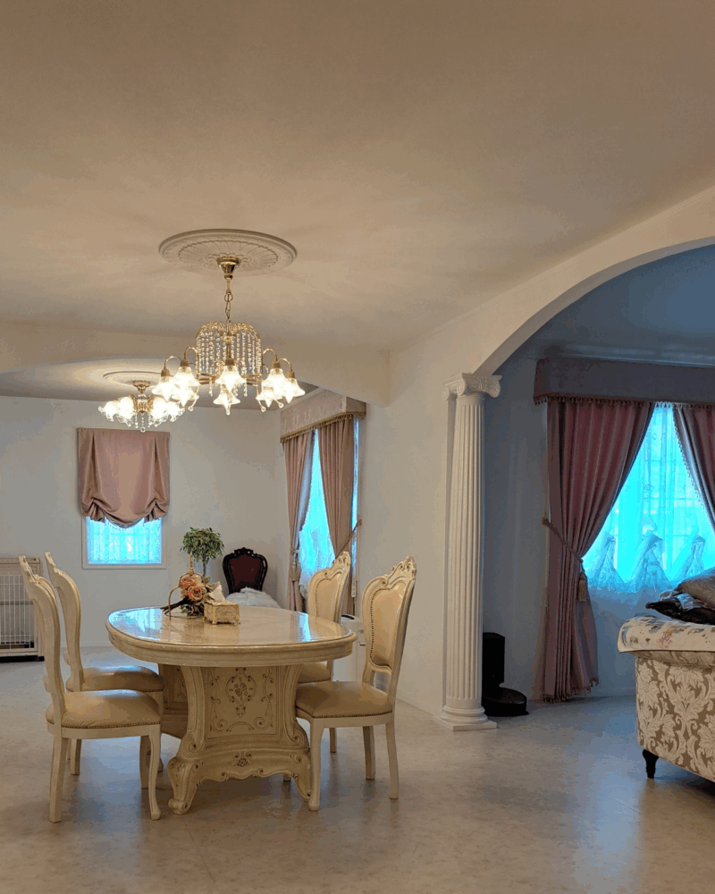 ダイニングの真ん中にあるクラシックなテーブルは、やわらかなピンクベージュ色と、丸みのある脚のデザインがとても優しいクラシカルな雰囲気。