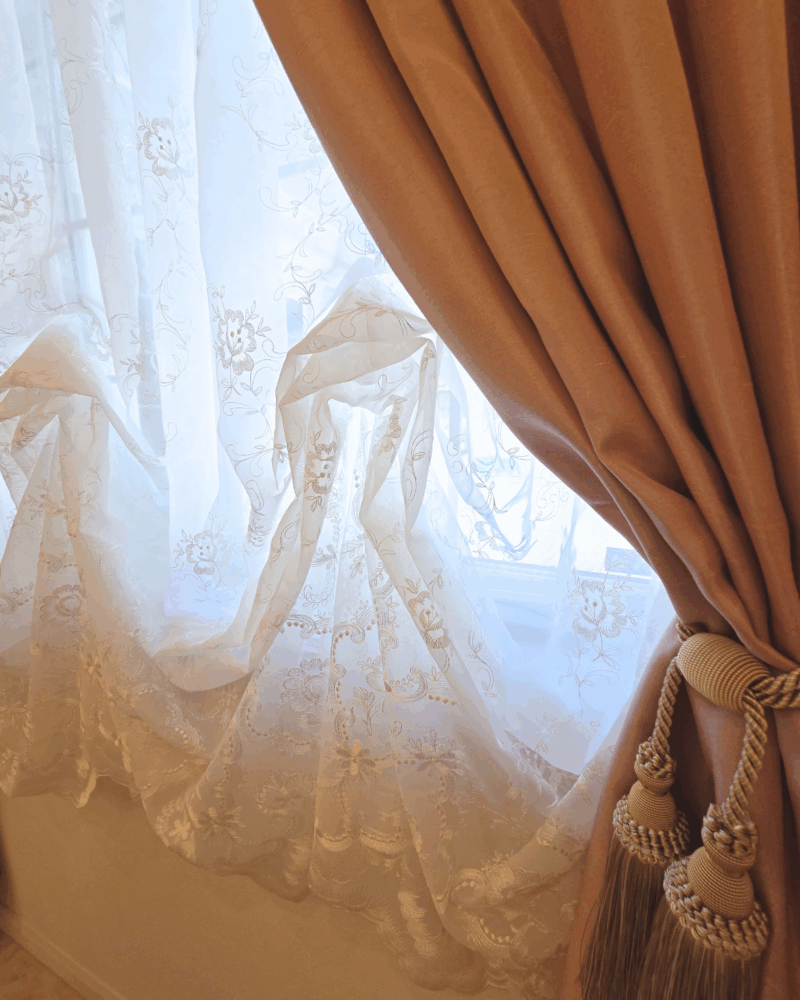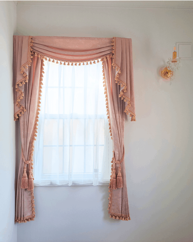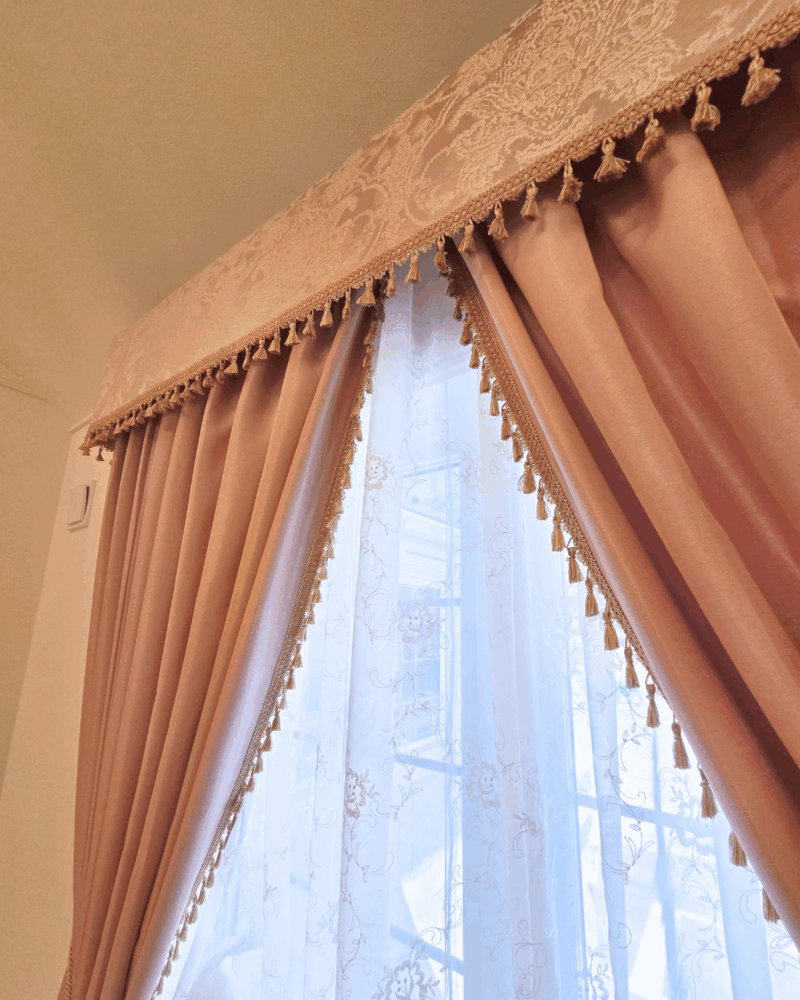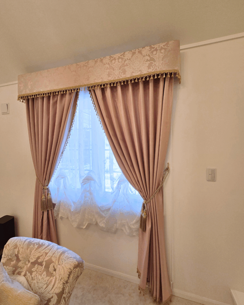 生地はクラシカルなデザイン家具を映えさせるため、あえて柄ではなく無地のもの、また日中光の入り方を調整しやすいように遮光生地を採用しました。アクセントに、フリンジをL字に付けました。