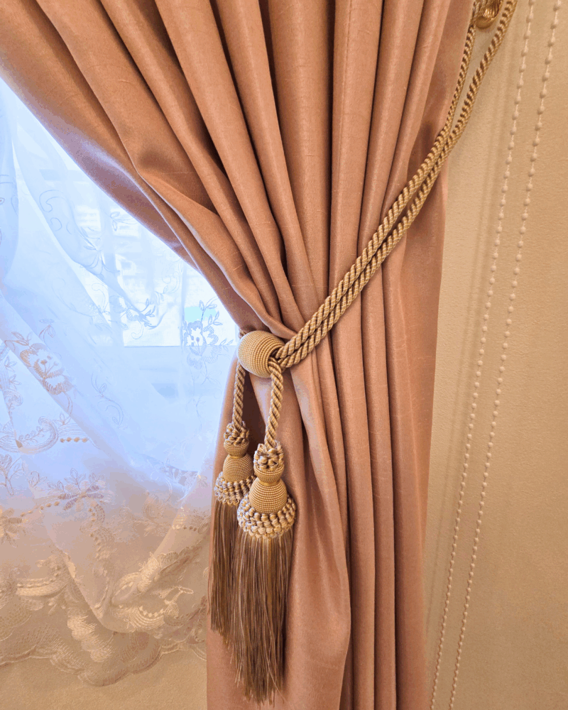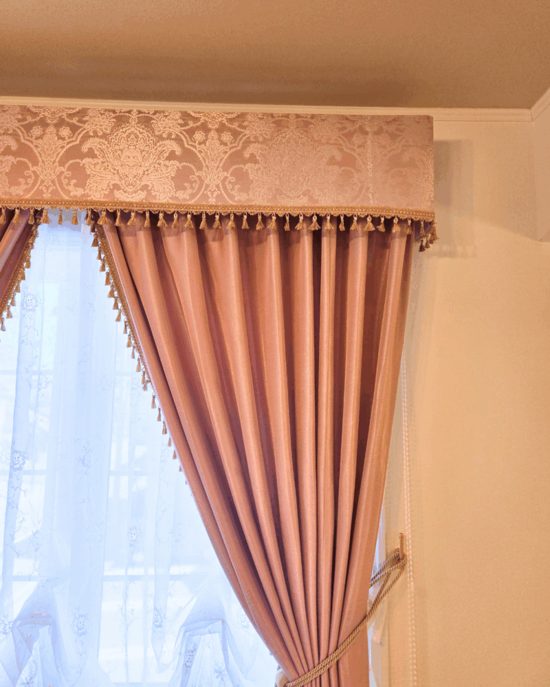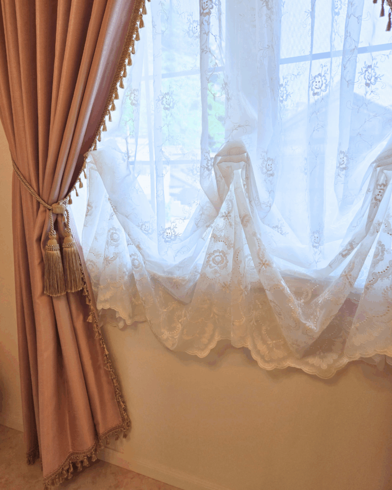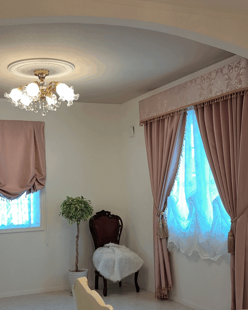 生地はクラシカルなデザイン家具を映えさせるため、あえて柄ではなく無地のもの、また日中光の入り方を調整しやすいように遮光生地を採用しました。アクセントに、フリンジをL字に付けました。