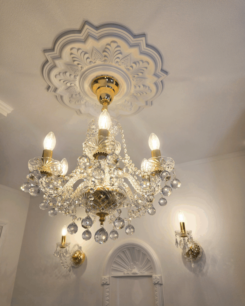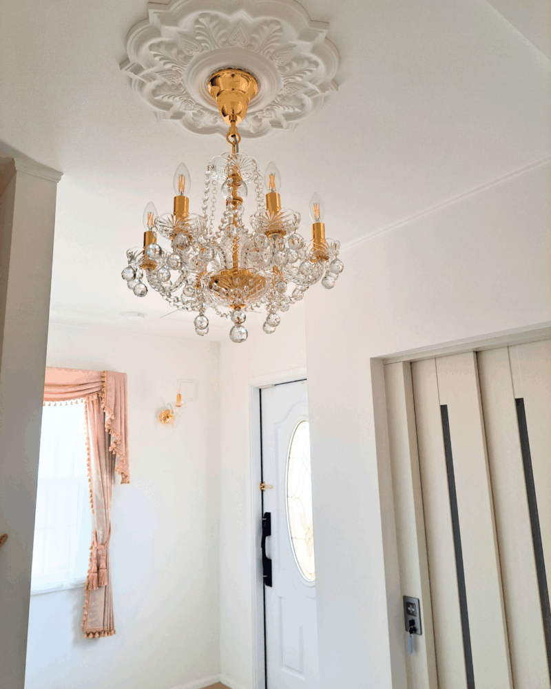 天井のメダリオンと組み合わせることで、まるで海外ホテルのような華やかな迎賓空間が完成しました。
