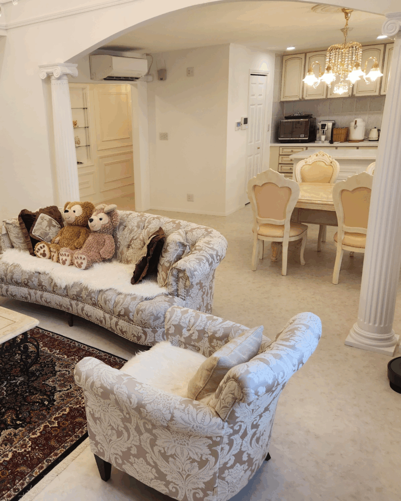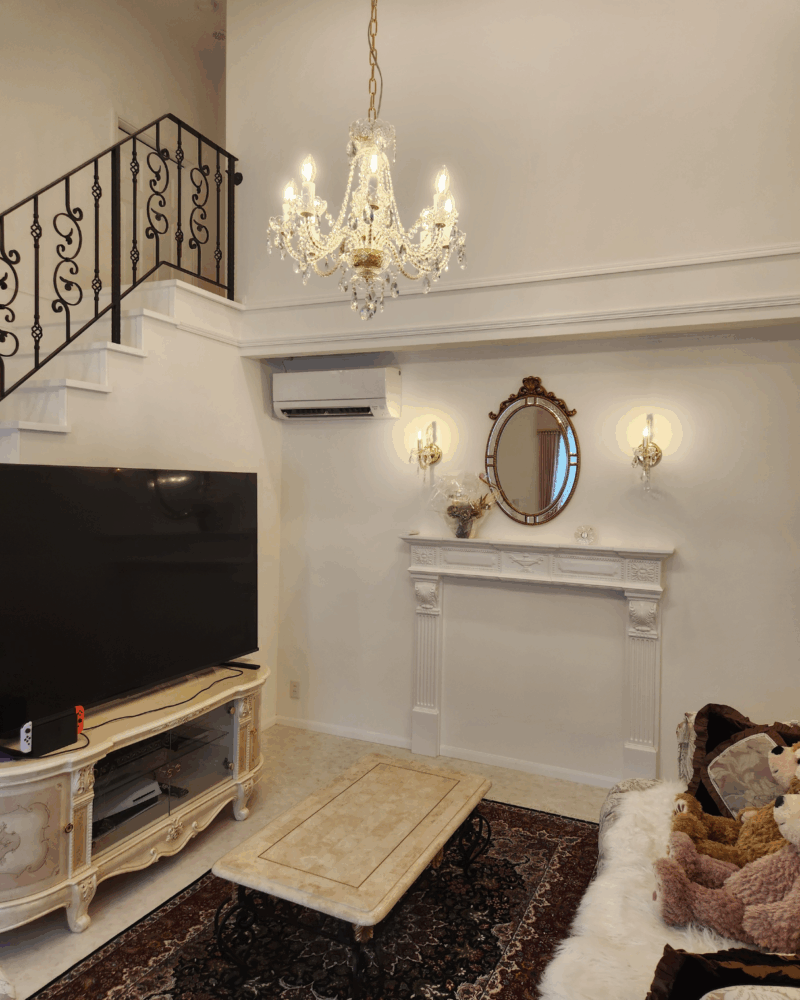 シンプルな白い空間とシャンデリアのゴールドが引き立て合い、気品を感じさせるホテルライクな演出になりました。