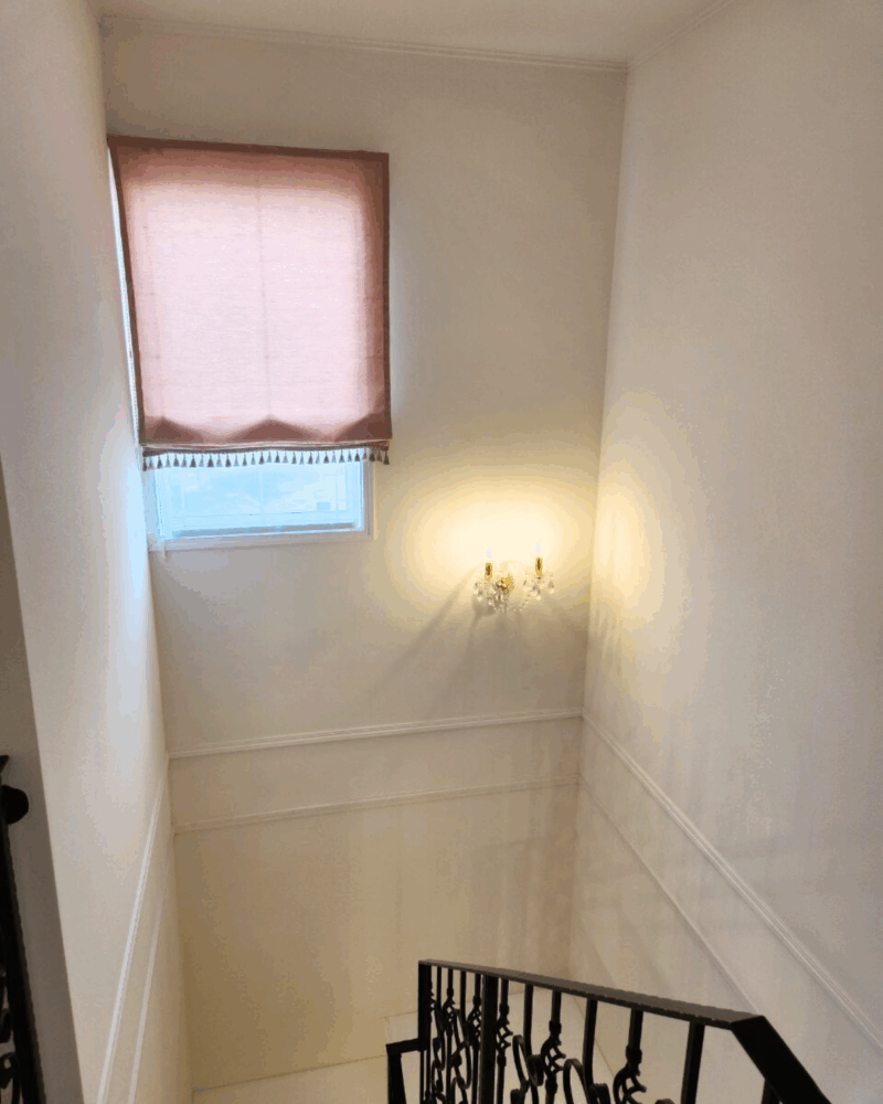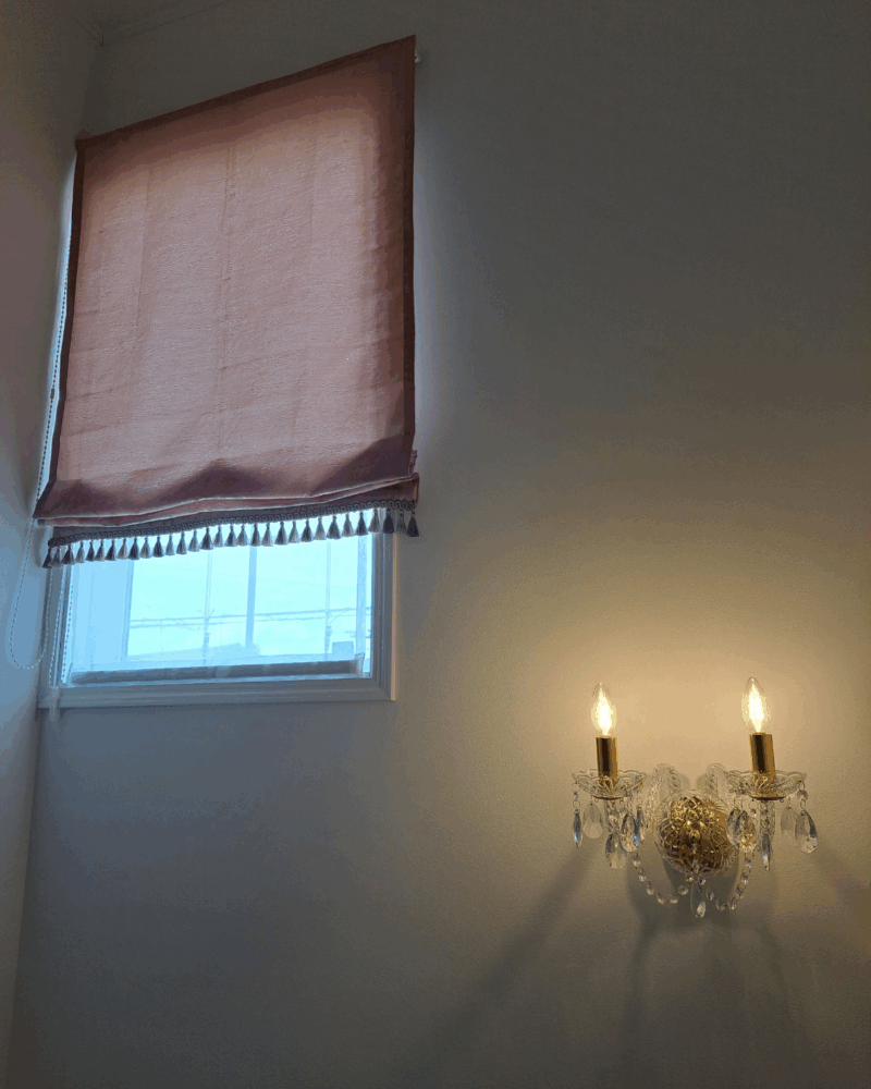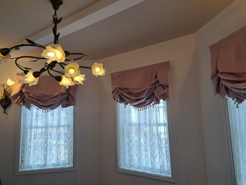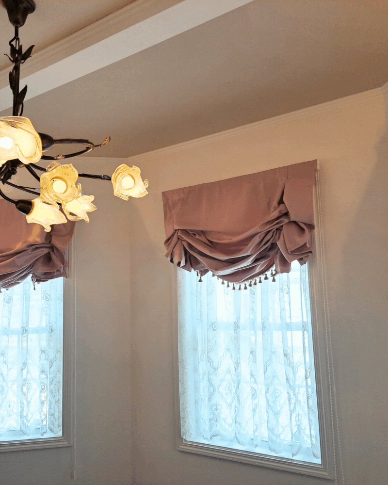 淡いピンクのローマンシェードも以前のお住まいで使用されていたもの。こちらには裾にトリムを付け新たに生まれ変わらせました。エレガンスなシェードカーテンとの組み合わせは、優雅さの中に女性らしいやわらかさを添えるアクセントに。