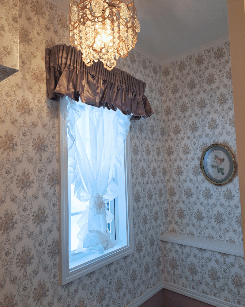 トイレの中の小窓には、ギャザーを寄せた小さなバランスカーテンを取付けました。