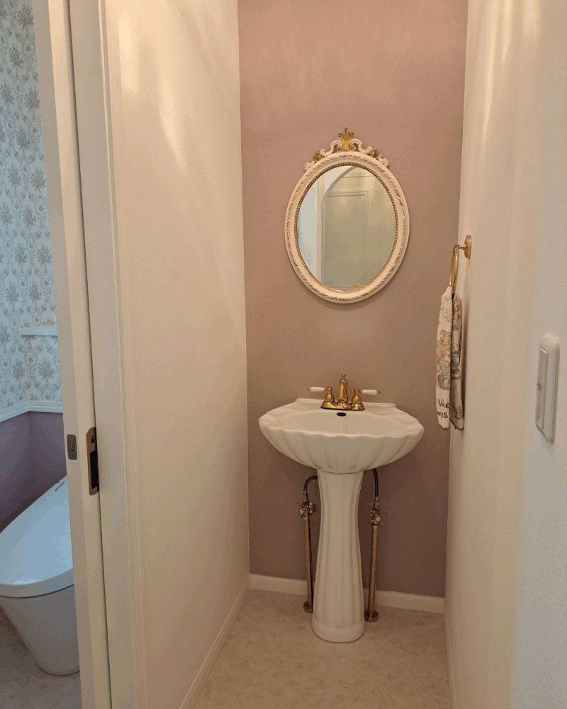 洗面所とトイレは、施主様の「したい」を叶えました。海外ライクな洗面台に合わせてイタリアのエレガントなミラーを。
