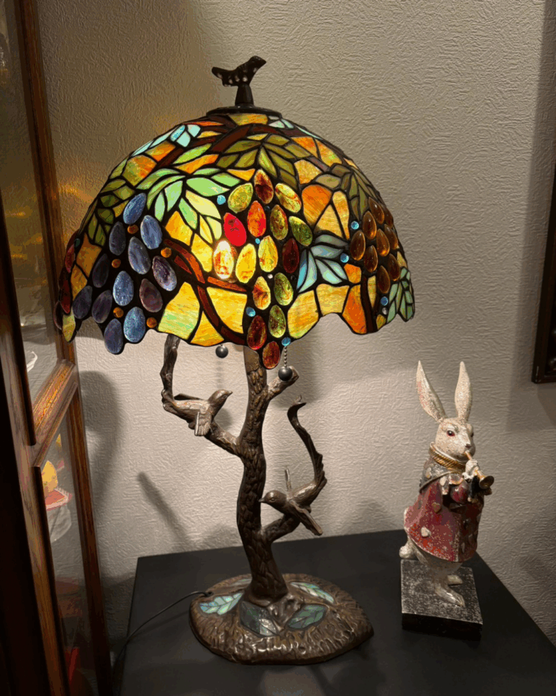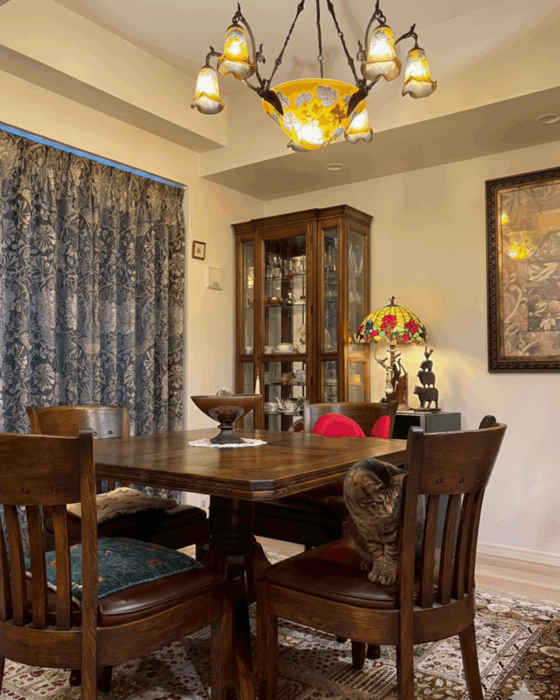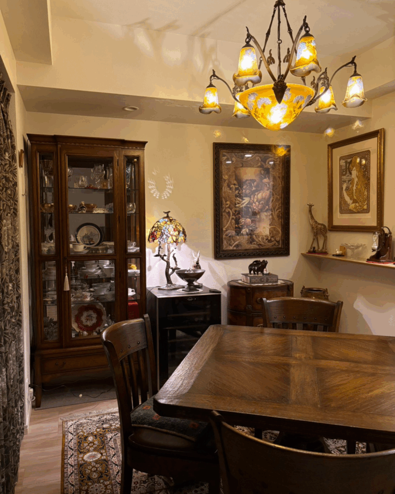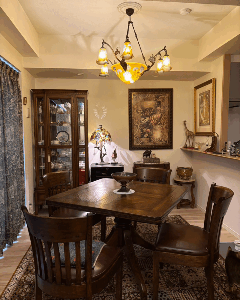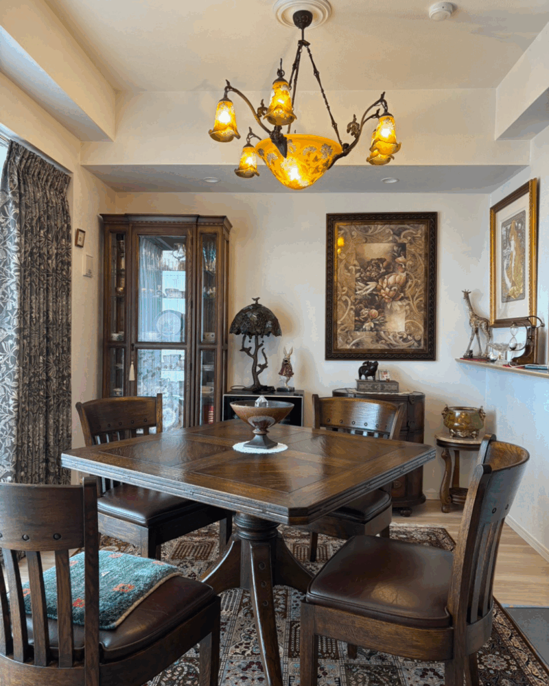 シャンデリアやステンドグラスのランプが放つ琥珀色の光は、家具に深い陰影を与え、空間に圧倒的なムードを醸し出します。