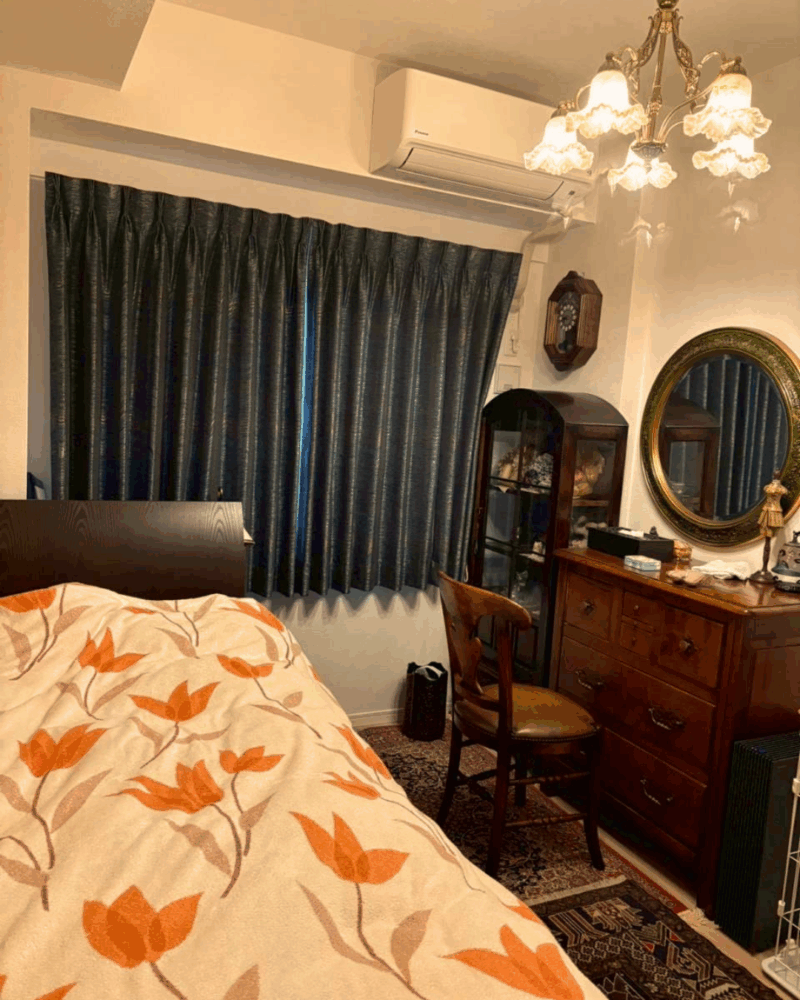 照明器具は、以前弊社でお求め頂いたスペイン製のアラバスター風シェードのシャンデリア。お部屋全体を包み込む、柔らかな光に包まれながら、お気に入りの時間を過ごす。良質なインテリアがもたらす「心のゆとり」を感じながら過ごしていただける寝室となりました。