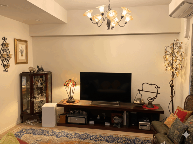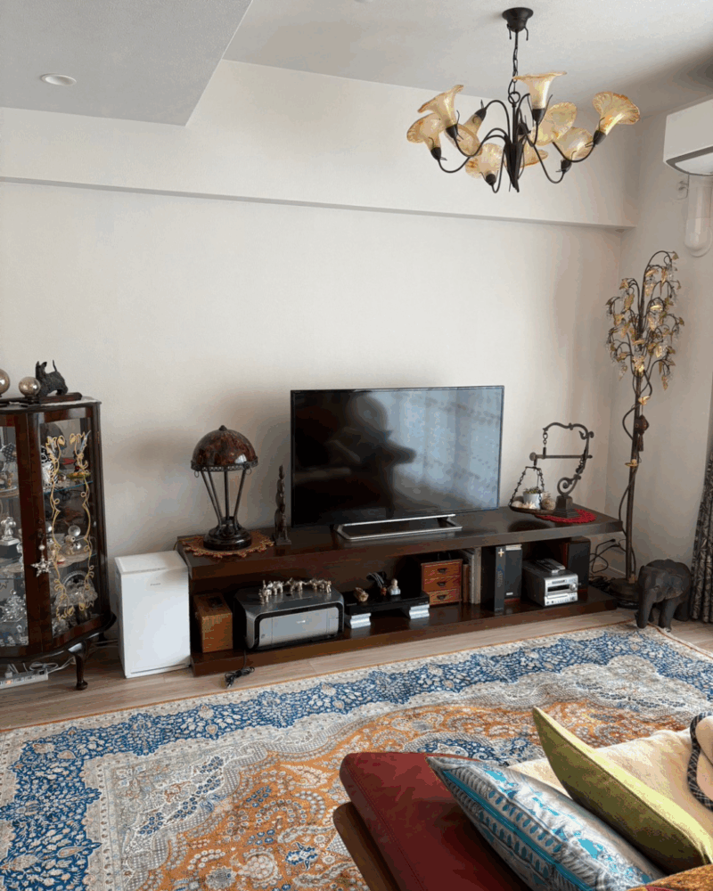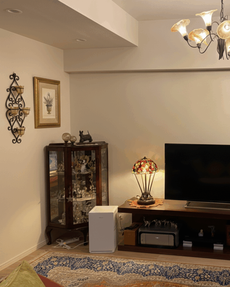 玄関に置かれたコンソールやペルシャ絨毯、リビングの隅で愛らしく光るぶどうモチーフのフロアランプなど、随所に遊び心が散りばめられています。