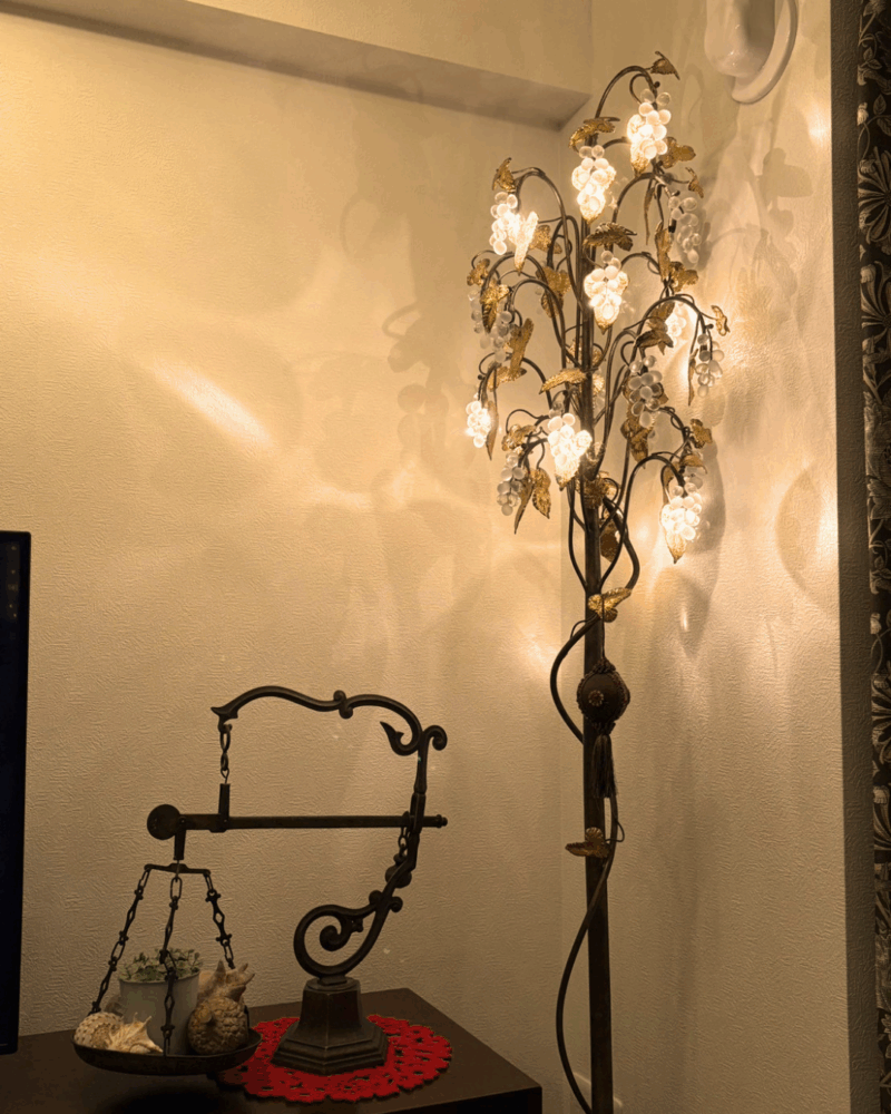 リビングでひときわ目を引く、ベネチアンガラスのぶどうモチーフがステキなフロアランプ。