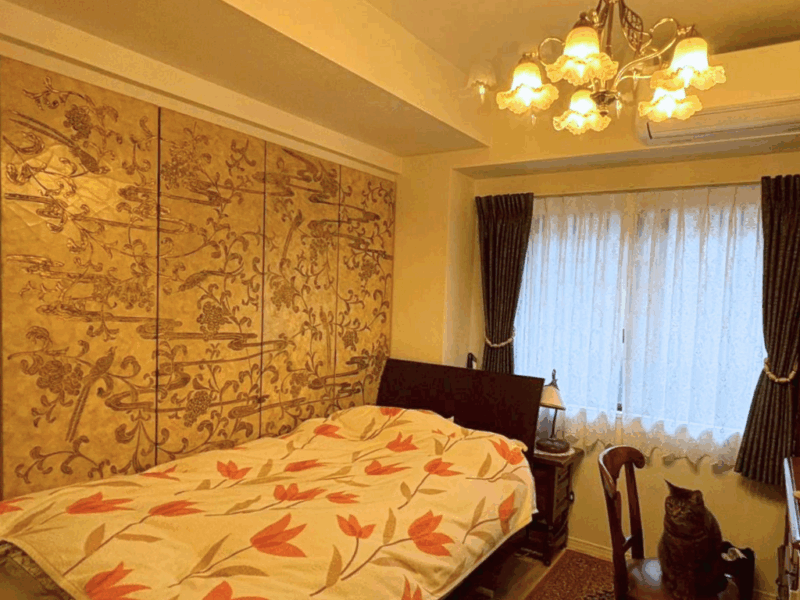 4. ホテルライクな静寂と、衝立のアクセントが光る寝室