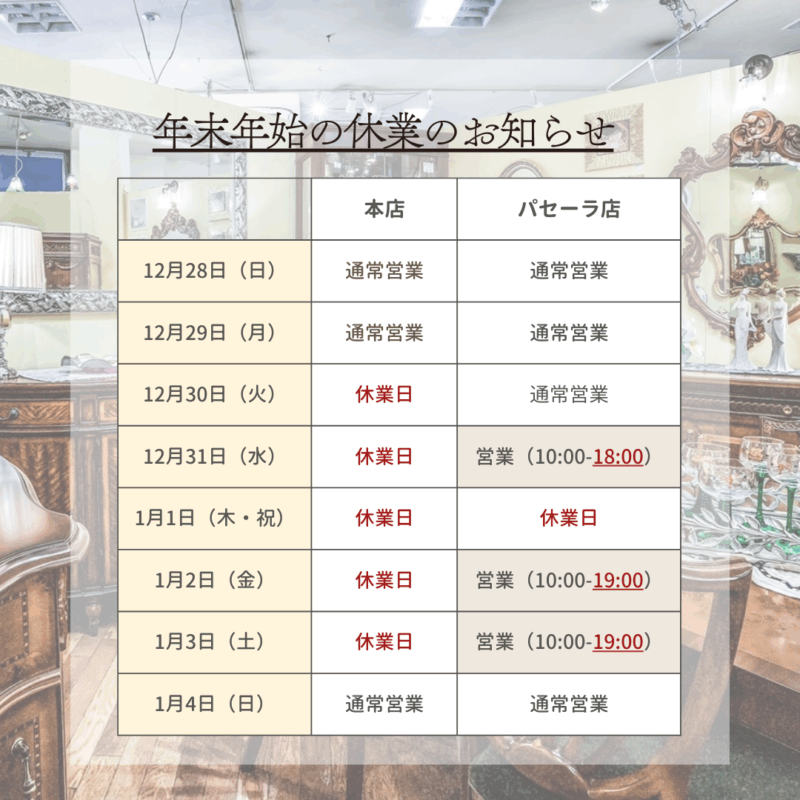本店は、12月30日(火)~26年1月3日(土)まで休業いたします。